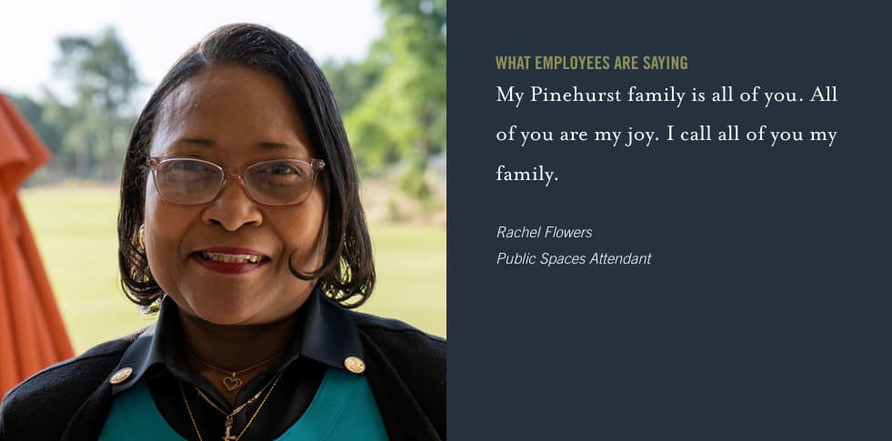 “We’re all a team. Everyone who works here – it all matters, from the golf shop to housekeeping to our restaurants, everything – it’s all connected and we’re all working together. I really enjoy that,” says Porcha Overbey, a front desk supervisor. “If one person is lacking, another one of us will pick it up. There’s just something about the magic of Pinehurst. You’ve seen that magic. That’s our team. That’s #teampinehurst.”