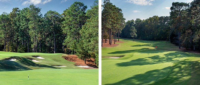 Both of these courses are par 72, but No. 9 is nearly 500 yards shorter than No. 2. You’ll enjoy wide fairways and undulating greens on both courses. No. 2 features Donald Ross’ signature turtleback greens, while you’ll find rolling greens on No. 9. Both courses are a true test and require focus, although a round on No. 9 is a bit more relaxed than No. 2.